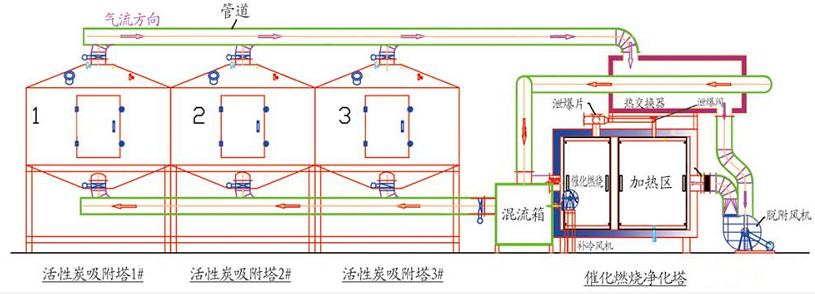 本設(shè)備是根據(jù)吸附(效率高)和催化燃燒(節(jié)能)兩個基本原理設(shè)計(jì)的,即吸附濃縮—催化燃燒法。包括三部分干式除塵、吸附氣體流程、脫附氣體流程: