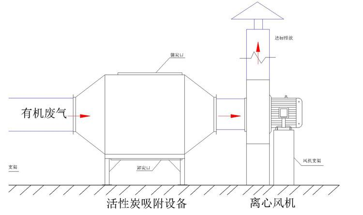 廢氣經(jīng)過吸附塔內(nèi)的初效過濾器除去固體顆粒物后,進入塔體,經(jīng)過活性炭層吸附后,除去氣體中的有機廢氣分子,達到符合排放標準的凈化氣體,經(jīng)風機排到室外。